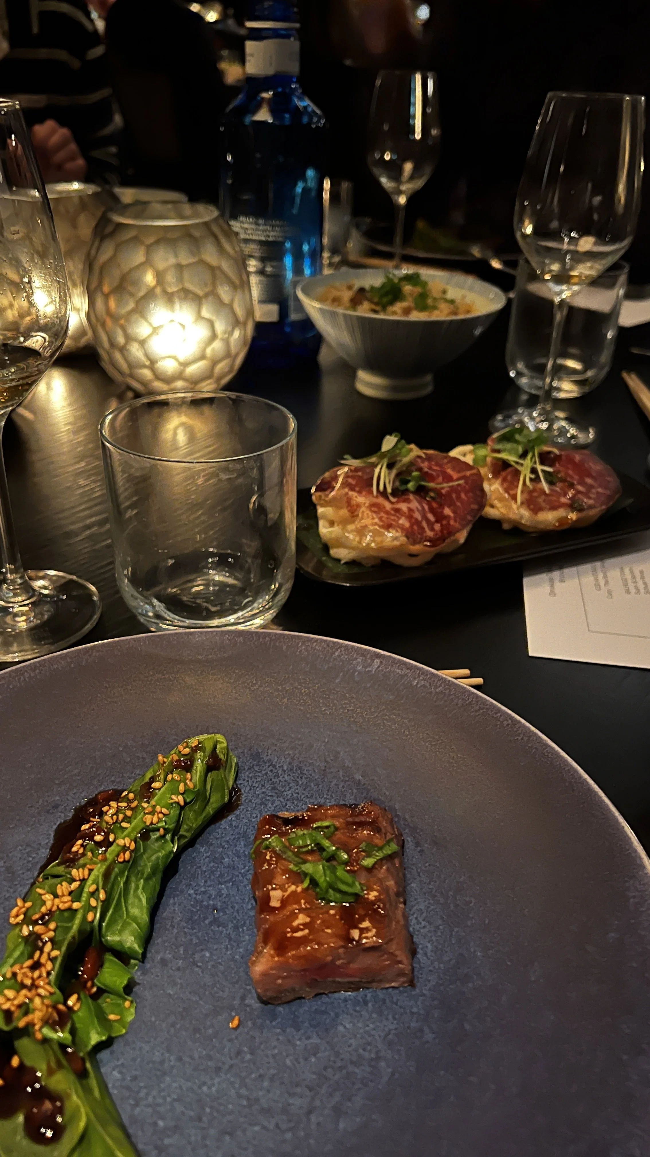 De volgende gerechten, zoals de kreeft (geserveerd als “cappuccino” soepje en gyoza), de Sichuan ma po tofu en de miso-gegaarde kabeljauw, waren indrukwekkend qua textuur en smaak. De kabeljauw, 24 uur sous vide gegaard, viel uit elkaar zo zacht. Ook de wagyu beef, favoriet van mijn tafelgenoten, was heerlijk mals en vol van smaak.