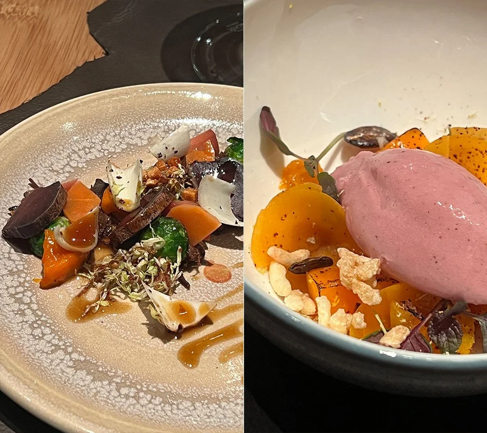 Mijn vriend Thijs besloot om voor het non-alcoholische arrangement te gaan. Deze bestond uit bijpassende sappen en kombucha’s geserveerd die allemaal zelf gemaakt waren door sommelier Femke en kan ik ook zeer aanraden. Champagne blijft toch uiteindelijk champagne, en met zo’n kombucha arrangement lopen de smaken veel meer uiteen.