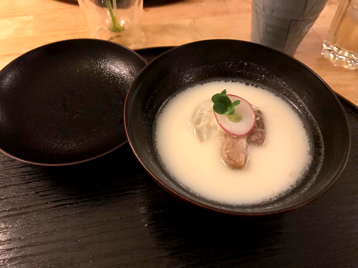 Soep van sojamelk met daikon en Iberico pork. Heel lekker!