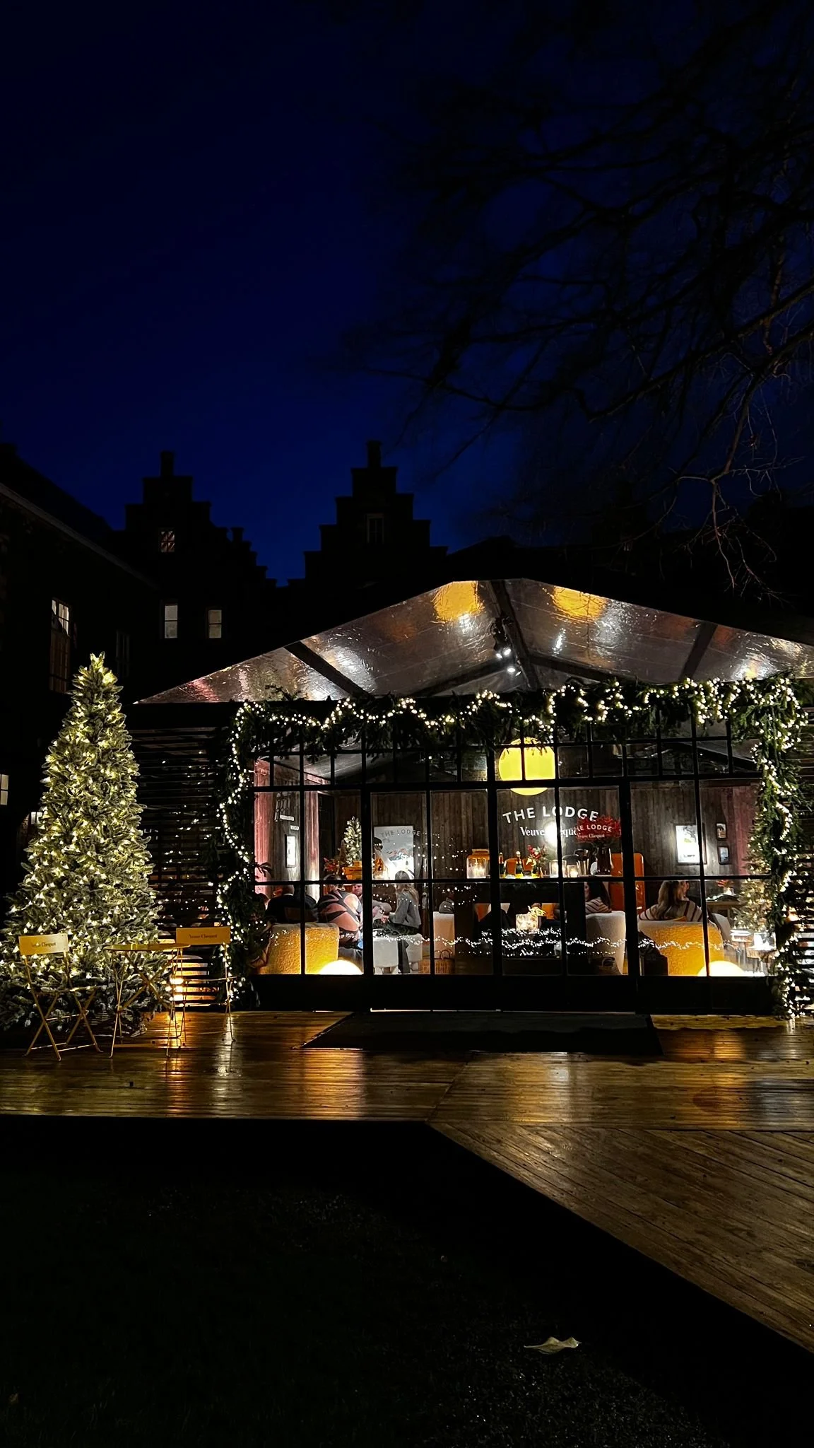 We liepen naar buiten om te dineren en besloten nog even het terrein te verkennen en door de tuin te wandelen. Het oude klooster was prachtig gedecoreerd met kerstverlichting. Ook waren er verschillende houten stalletjes opgezet waar je gepofte kastanjes en glühwein kon drinken. Verder was er een pop-up van Veuve Cliquot in een glazen kas waar je heerlijk bij het haardvuur kon kaasfonduen. Dit alles droeg bij aan een gezellige sfeer.