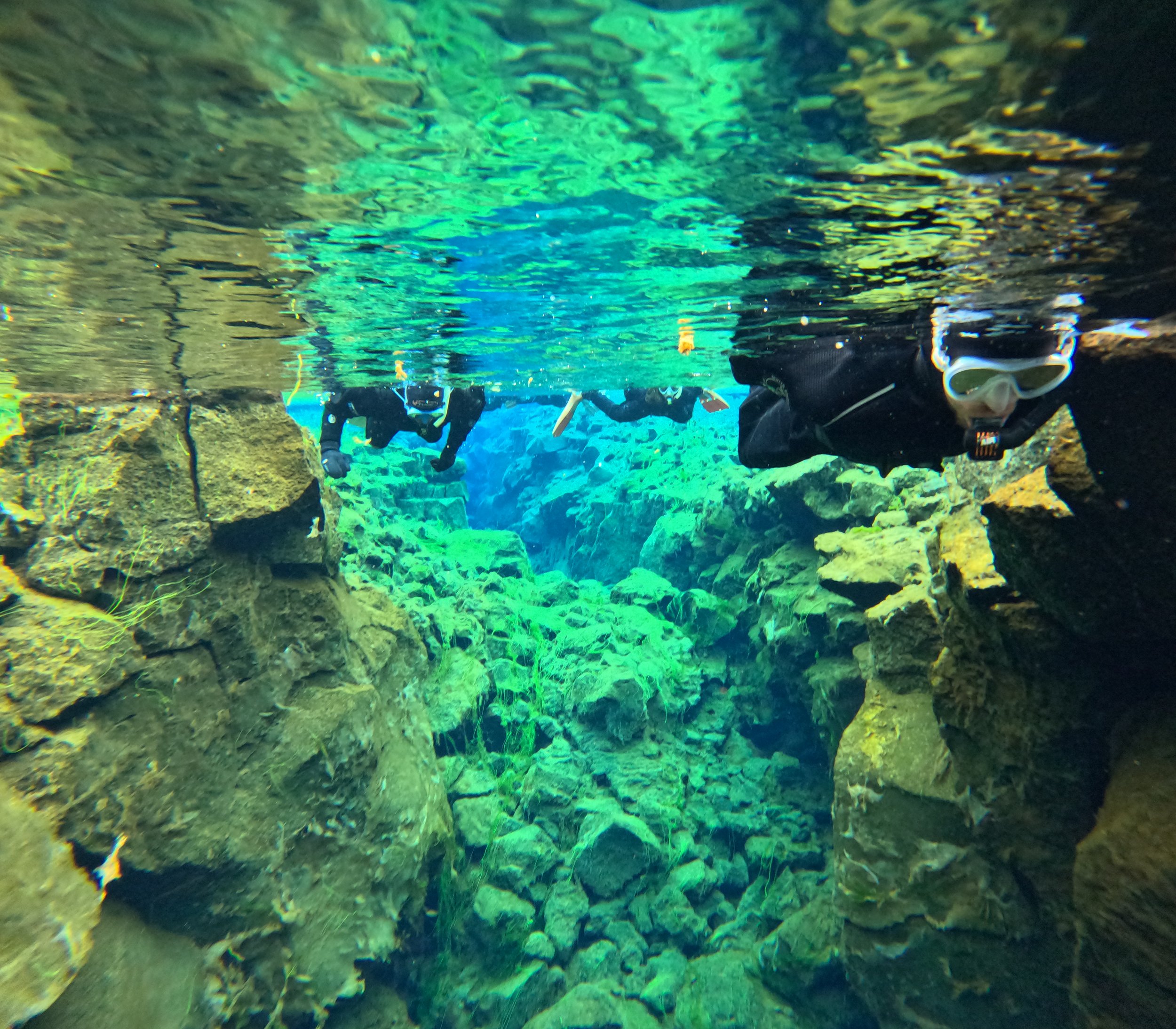 De dag begon met… snorkelen! In het ijskoude water van de gletsjers in Silfra werden we opnieuw in waterdichte pakken gehesen en kregen we onze snorkels aangemeten.